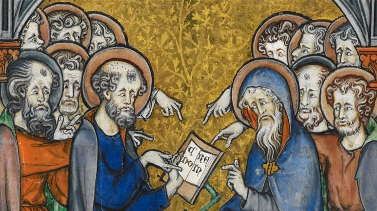 «Qué es el Keyrgma» / Representación del siglo XIII, correspondiente a  los 12 apóstoles, recibiendo inspiración y preparando el credo / Imagen de dominio público