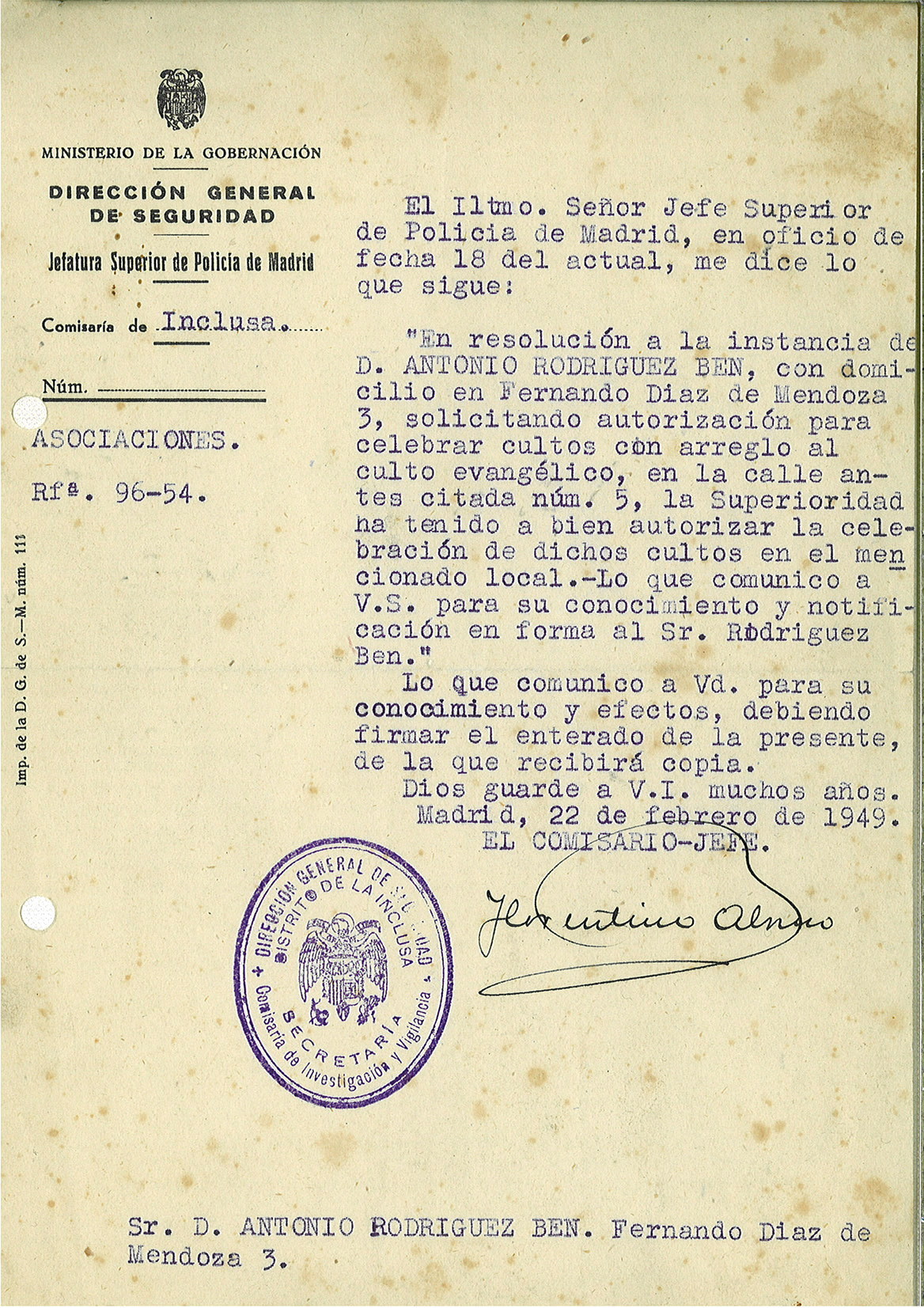 Documento histórico«la Superioridad ha tenido a bien autorizar la celebración de dichos cultos en el mencionado local», rezaba el documento, expedido por la Dirección General de Seguridad con fecha 22 de febrero de 1949.
