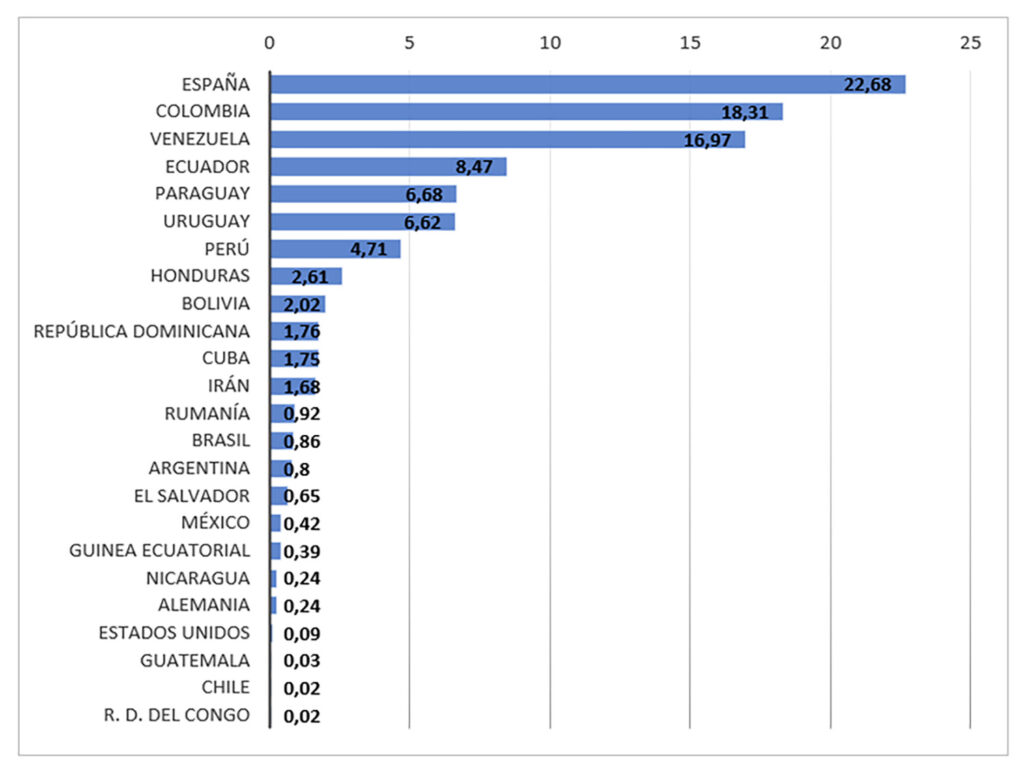 PORCENTAJE DE NACIONALIDADES LATINOAMERICANAS PRESENTES EN LAS IGLESIAS EVANGÉLICAS DE MADRID[vii]