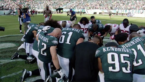 Jugadores del Philadelphia Eagles, orando a Dios en un momento del partido