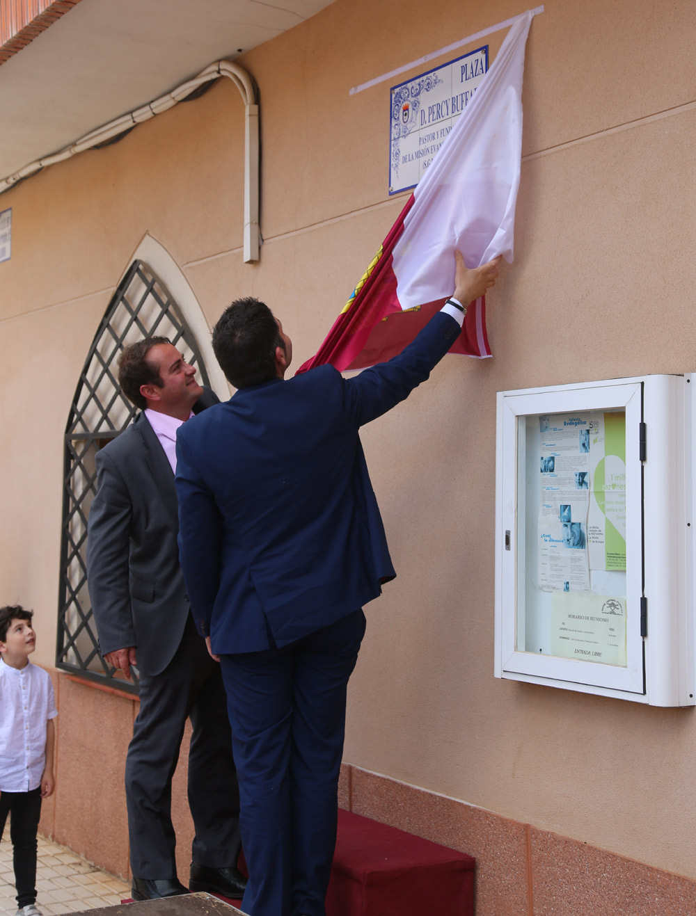 Alcalde y representante de la oposición descubren conjuntamente la placa con el nombre de Percy Buffard ante la atenta mirada de un niño