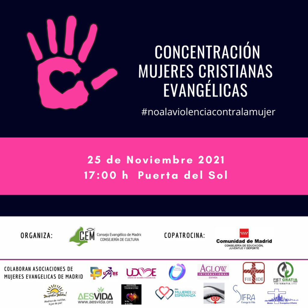 Con tal motivo, el Consejo Evangélico de Madrid organiza, en colaboración con varias organizaciones de mujeres evangélicas de la Comunidad de Madrid, una concentración el día 25 de noviembre a las 17:00 hs en la Puerta del Sol.