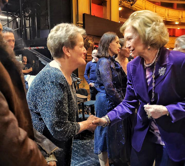 Nancy Roncesvalles (i), directora del Coro Gospel de Madrid, recibe el saludo y la felicitación de la reina Sofía el pasado 2 de enero / Foto: FB de Amos E. Obasohan