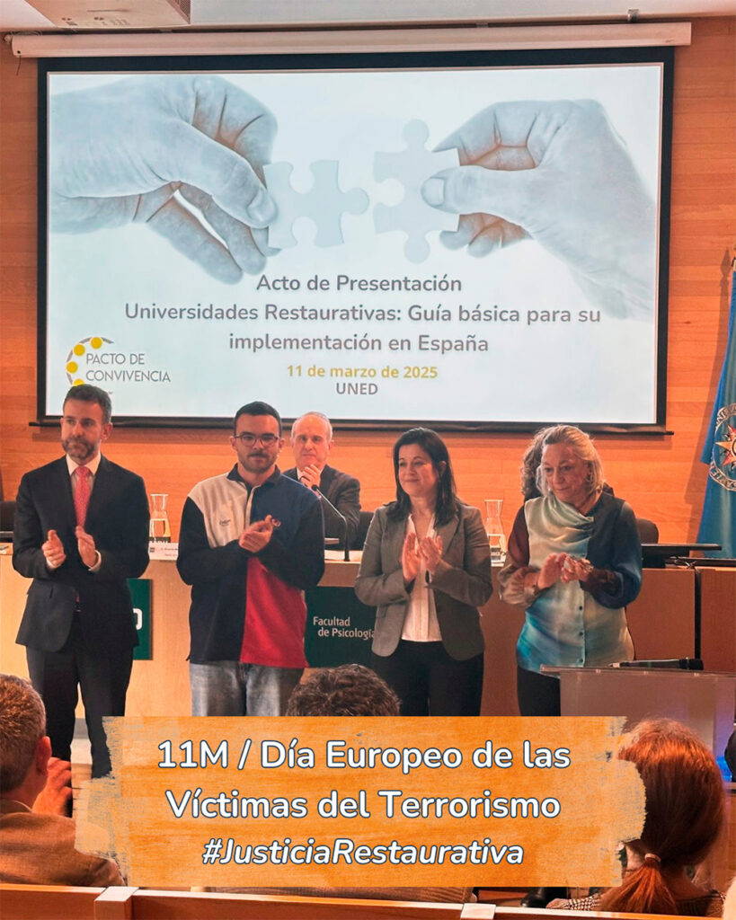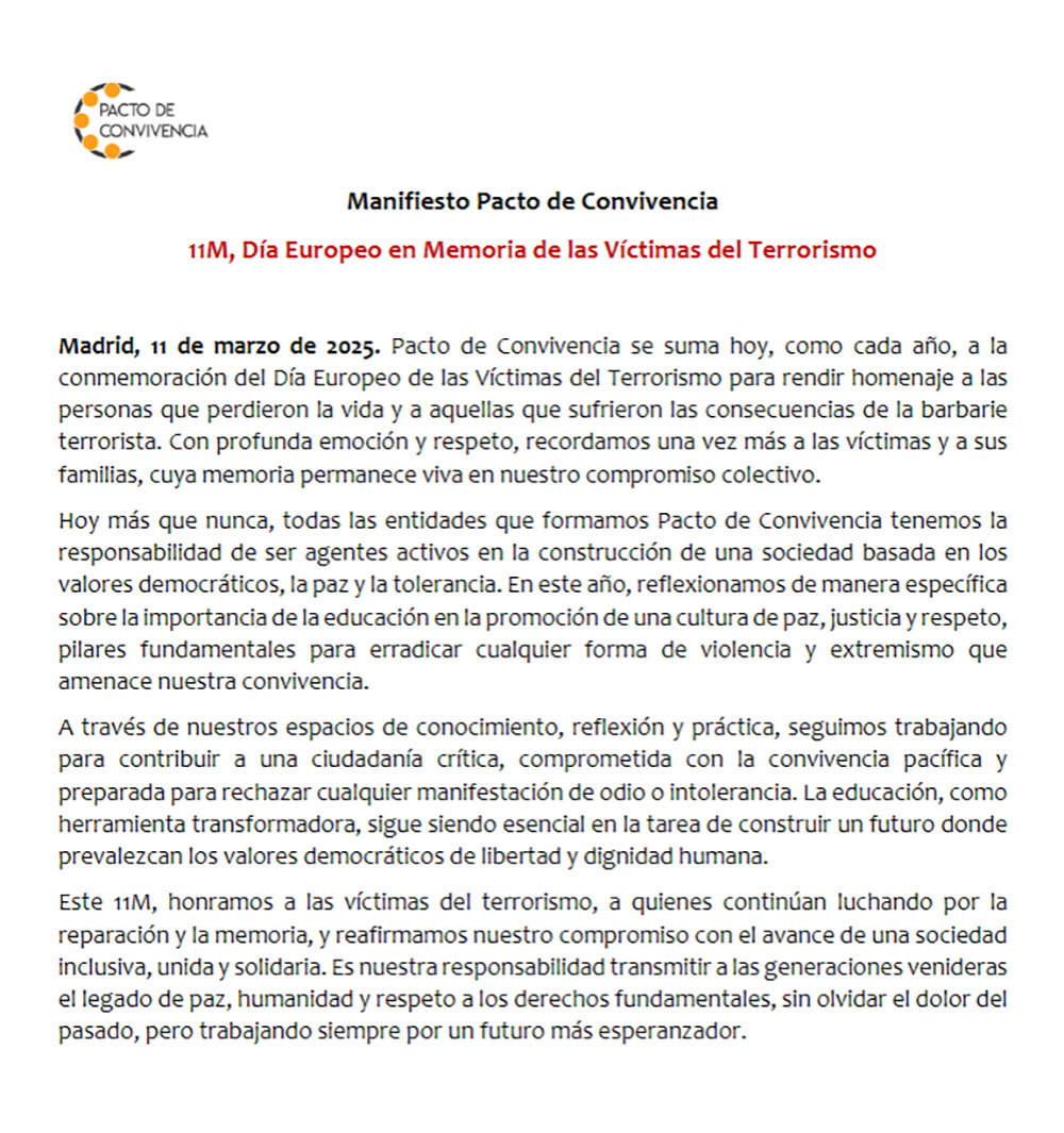 “Este 11M, honramos a las víctimas del terrorismo, a quienes continúan luchando por la reparación y la memoria, y reafirmamos nuestro compromiso con el avance de una sociedad inclusiva, unida y solidaria. Es nuestra responsabilidad transmitir a las generaciones venideras el legado de paz, humanidad y respeto a los derechos fundamentales, sin olvidar el dolor del pasado, pero trabajando siempre por un futuro más esperanzador.”, concluye el manifiesto, que puede leerse completo aquí: www.pactodeconvivencia.org).