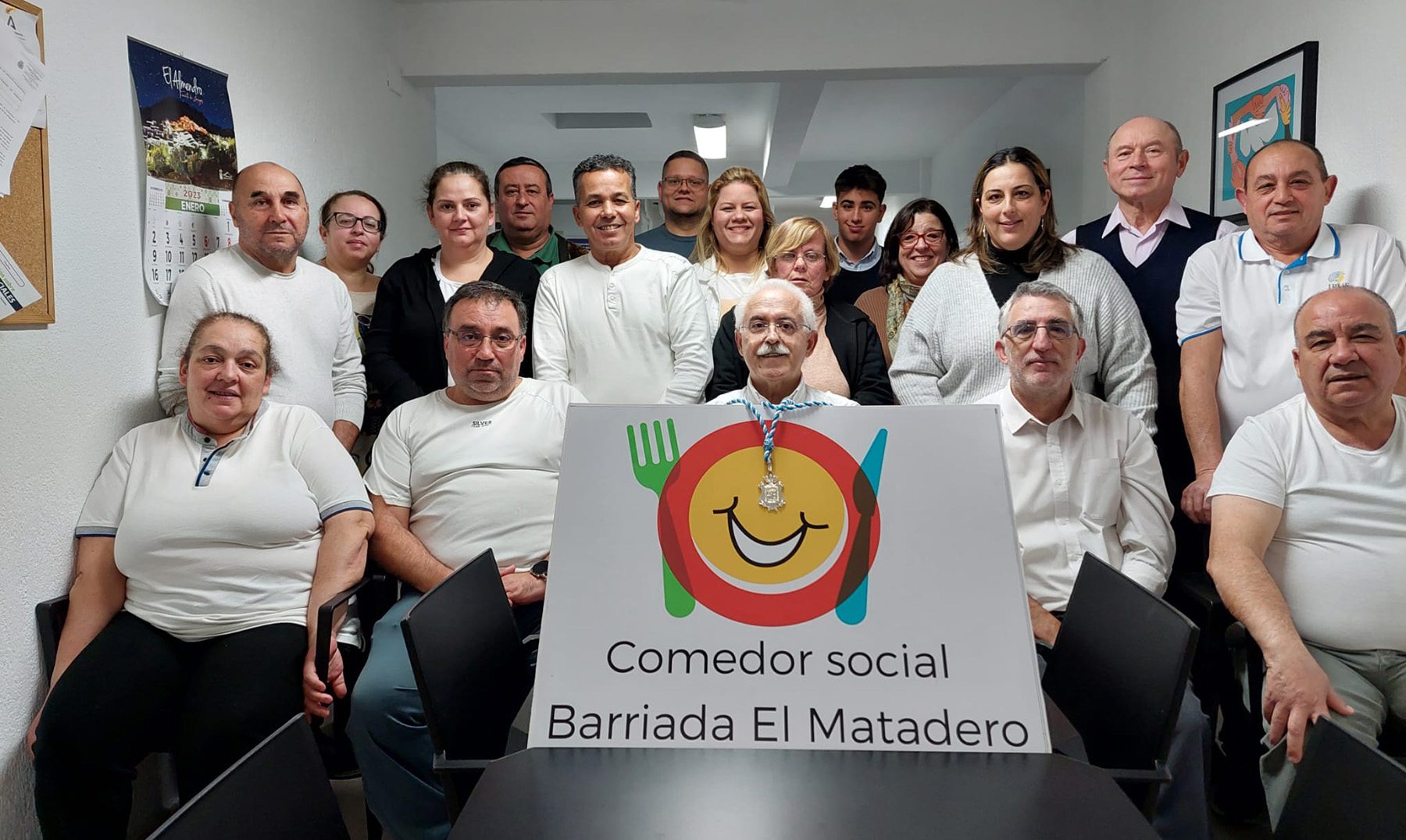 «Los voluntarios y voluntarias de el Comedor Social de la Barriada de El Matadero de Huelva, muy contentos y agradecidos por el galardón concedido por el Excmo. Sr. Alcalde, D. Gabriel Cruz Santana y la Corporación Municipal de Huelva, en la persona responsable del mismo, Luciano Gómez. ¡¡MUCHÍSIMAS GRACIAS!!»