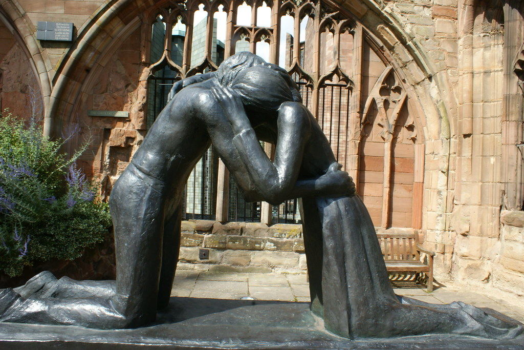 Reconciliación, obra de la escultora Josefina de Vasconcellos, Catedral Anglicana de Coventry, Inglaterra (UK). Una réplica idéntica reposa en el Jardín de la Paz en Hiroshima, Japón