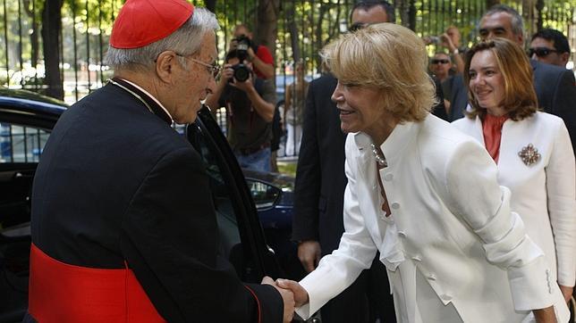 El cardenal arzobispo de Madrid saluda ayer a Carmen Cervera, en la inauguración de la exposición de imágenes sacras