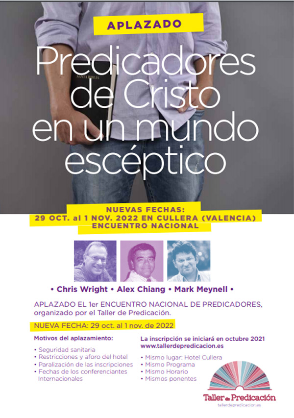 20200928 1aDe este modo, el evento se aplaza para los días 29 de octubre al 1 de noviembre de 2022. Como estaba previsto, el lugar de su celebración será el Hotel Cullera (en Cullera, Valencia), y los conferenciantes invitados, Christopher Wright (actual director del ministerio internacional); Alex Chiang; y Mark Meynell. “También habrá numerosos talleristas nacionales que dirigirán los seminarios optativos”, informan.