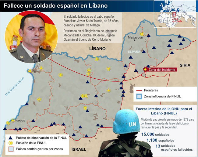 (LÍBANO, 29/01/2015) El cabo Francisco Javier Soria Toledo, de 36 años, perdió la vida este miércoles en el sur de Líbano al resultar alcanzado por un proyectil lanzado por el Ejército de Israel en represalia por un ataque de la milicia chií Hezbolá.