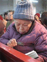 Detrás del púlpito una enorme cruz me llamó la atención: No estaba hecha de ningún metal precioso sino recubierta con papel rojo metalizado. Su simplicidad me llevó a doblar mis rodillas y orar reverentemente en silencio. Cuando llegamos nosotros, quince minutos antes del culto, la iglesia estaba ya casi llena. Durante la reunión me fijé en una señora mayor sentada detrás de mí que seguía la lectura de la Biblia con una lupa. El pastor, de unos 80 años, predicaba que «Nosotros (los cristianos) somos como ovejas» De vez en cuando –y esto es lo interesante– mostraba una pequeña hoja de papel garabateada con los puntos del sermón. Era la primera vez que veía a un predicador hacer esto con su bosquejo.