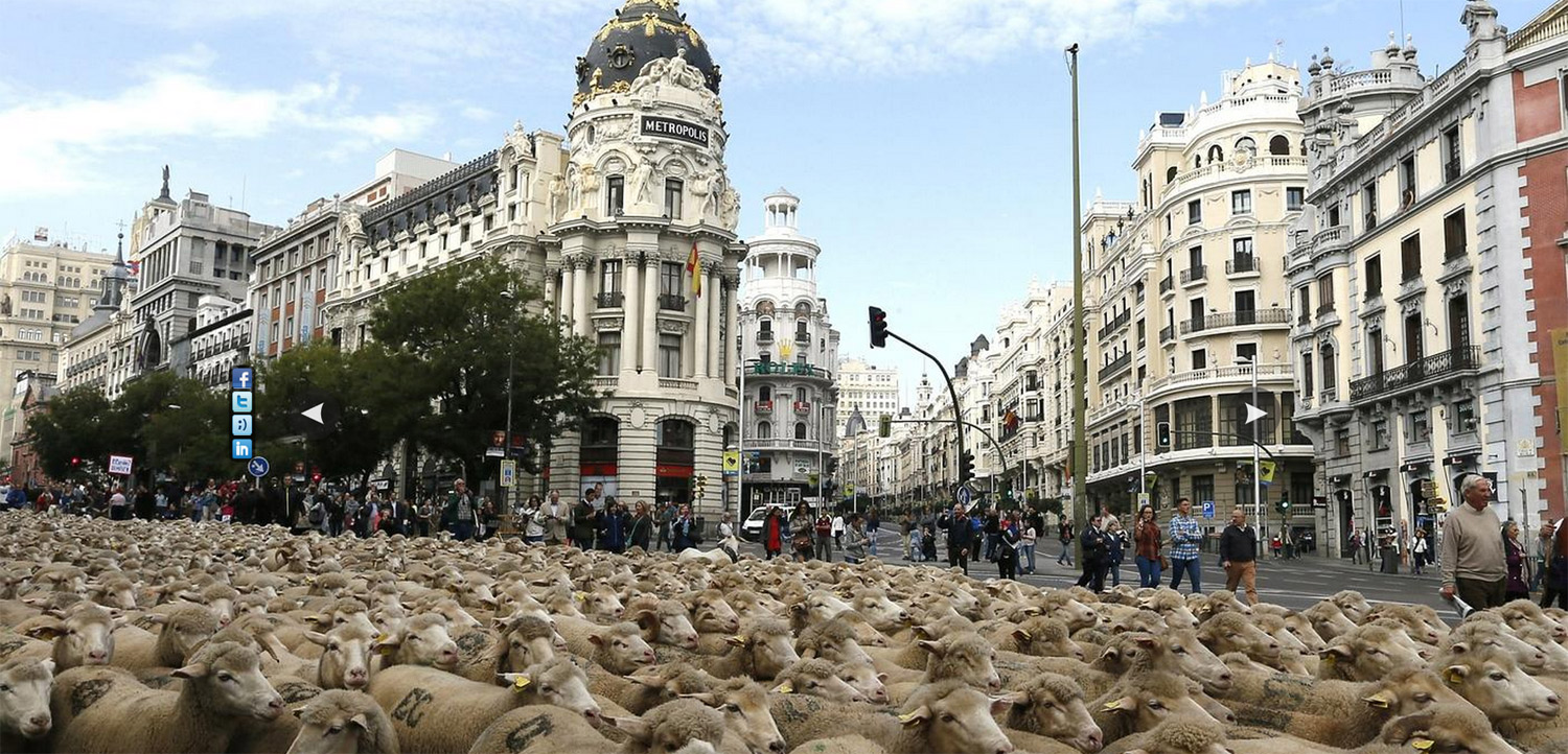 (JORGE FERNÁNDEZ, 07/11/2014) | Curiosa imagen la que se produjo esta semana en la capital de España, cuando un rebaño de 2.000 ovejas merinas recorrió las principales calles y plazas de Madrid en un bullicioso desfile, con motivo de la celebración de la XXI Fiesta de la Transhumancia.