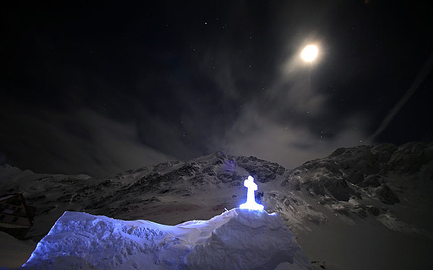 Un sacerdote ora en la capilla de hielo, construida a 2000 metros sobre el nivel del mar / FOTO: AP